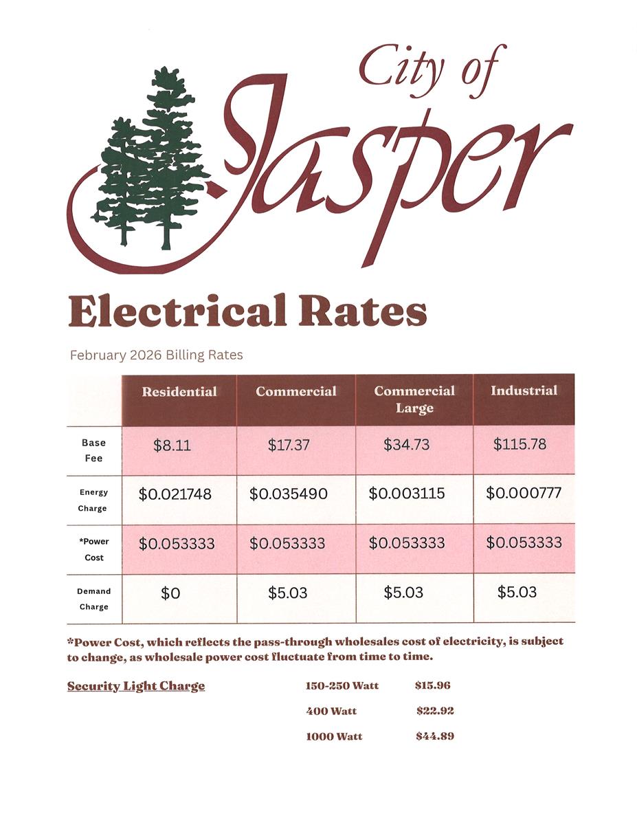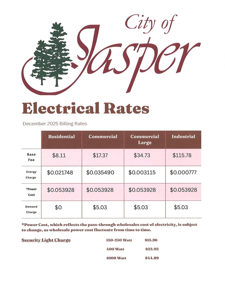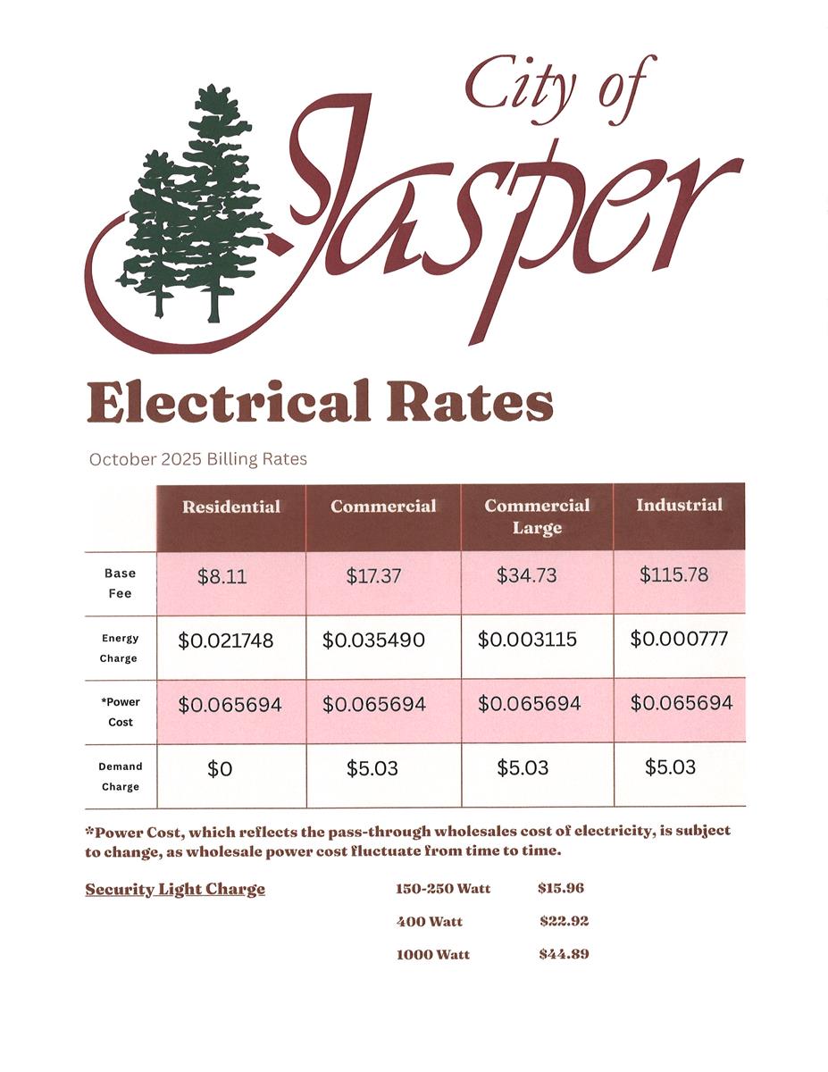 These are both variable costs (costs that vary each month depending on the amount of electricity used) that are based on the amount of electricity (kWh) used by the customer for the month. The energy charge and power cost are multiplied by the kWh used by the customer to come up with a dollar amount to be charged for each of these items. The energy charge represents the non-fuel cost to produce the electricity used (such as the cost of the power lines, for example). In contrast, the power cost is merely a pass through cost for any purchased power and the fuel needed to generate the required electricity used. The power cost is the cost that is charged to Jasper to purchase the power supplied to customers. Along with some other local municipalities, Jasper purchases its power from Sam Rayburn Municipal Power Association (SRMPA). These costs vary each month, based on market forces, and are passed on directly to customers based on their usage share of the power purchased.